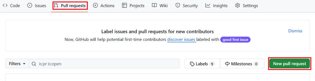 プルリクエストの作成は、「Pull requestsタブ」の「New pull request」などから行います。Pull requestsタブには、作成されたプルリクエスト(レビュー依頼)がリストアップされます。