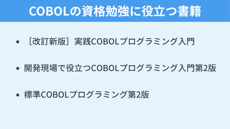 唯一、ITパスポートはいまだにCOBOLに関連する問題を出していますが、問題量はごくわずかです。ただ、IT業界でのキャリアを継続するうえで、COBOL以外のIT知識があることを証明するのに役立ちます。ITパスポートに限らず、基本情報処理技術者・応用情報技術者などITの基礎にまつわる資格を取っておいて損はないものの、日本語でCOBOLを専門的に学ぶ場合は独学しかないのが現状です。
