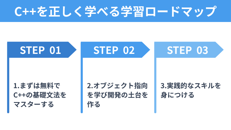 C++の文法の基礎、およびC++を理解するために必要不可欠なオブジェクト指向の概念を理解し、C++の基礎をしっかりと固めることができた段階で、次のステップである実践的なスキルの学習を行うことがポイントです。