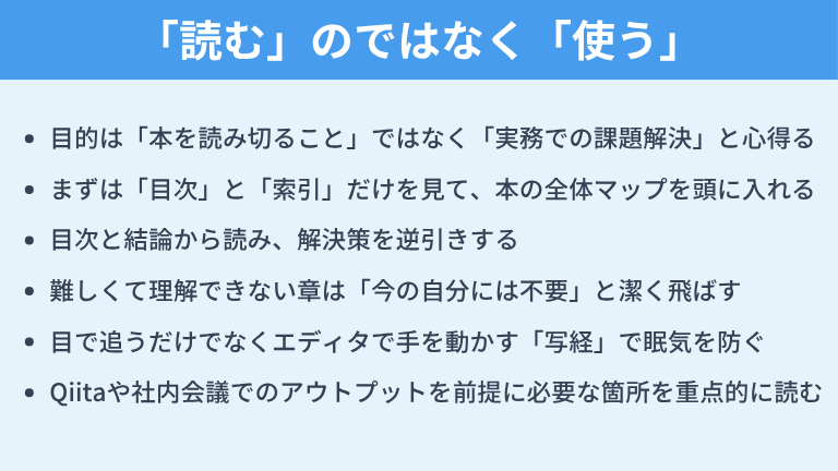 本は最後まで読み切る事をゴールと考えがちですが、実際には実務で直面している課題や将来的に身につけたいスキルを1つでも身につけ、アウトプットに活かせるかが重要です。たとえ1つの章、数ページを読んだだけでも、今まで書けなかったコードが書けるようになったりチーム会議がスムーズに進んだりすれば、その本の価値は十分に回収できたと言えます。読み切る事を目的にせず、実務の課題を解決する事を目的にして読書に臨む意識が大切です。