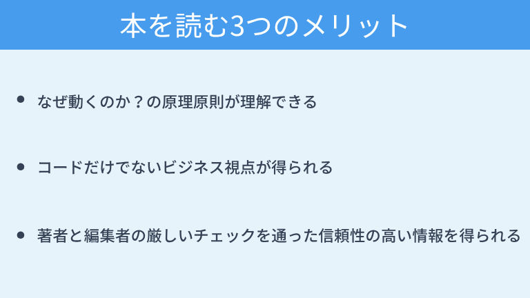 一方でネット上の記事は「この記事のコードを使えば動きます(How)」という情報に寄りがちです。実務の中では動かすことは確かに重要ですが、それで終わっていては応用力が身につきません。根本的なエンジニアとしての実力を身につけたいなら、本で原理原則を身につけるべきです。