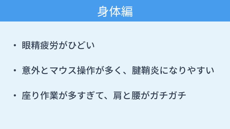 エンジニアの仕事は、ほぼ座り作業です。特に納期が近かったり、難しいバグと格闘していたりすると、気づけば何時間も同じ姿勢で過ごしていることがあります。その結果として、肩と腰のコリがほぼ慢性化してしまうのです。