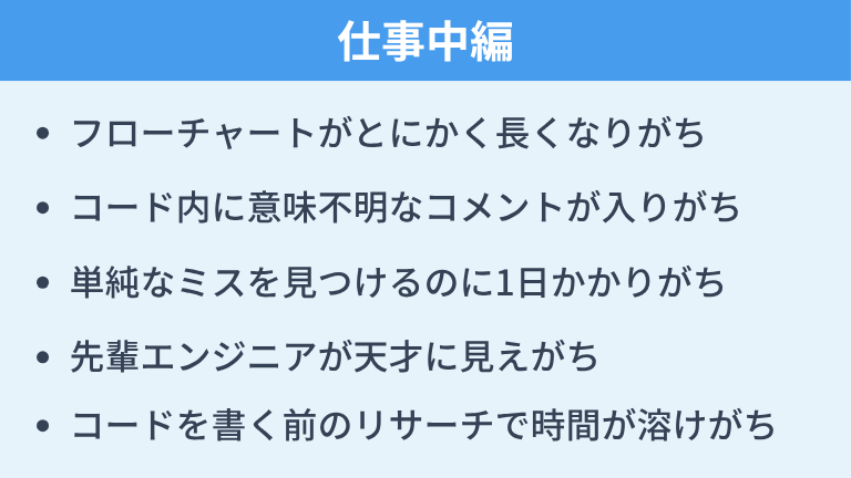 実際には、先輩も同じようなミスを繰り返し、膨大な経験から「勘」と「経験」を地道に磨いてきた結果なのです。キャリアステージが上がるにつれて、自分もかつての先輩のように見られる側になります。「天才に見えた先輩と同じミスをしている自分」に気づくのも、エンジニアのあるあるです。