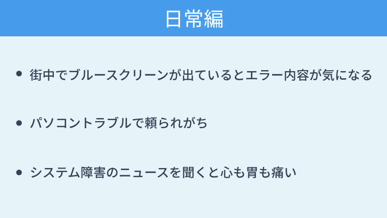 自分自身が過去にインシデント対応した経験があると、ニュースを他人事として見られなくなります。「あのとき自分たちが徹夜でリカバリーしたときと似ている」「あの規模の障害なら復旧に何時間かかるだろう」と、つい職業的な視点で分析してしまうのです。